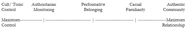 Cult/Toxic Control. The final item on the continuum, a situation where the control is toxic and/or cult-like, would seem self-explanatory. In a cult, there are all too often very extreme controls in place to keep people in line. It is not about community for the betterment of the individual. Rather it is about controlling those in the community for the purpose of using them and their resources for the betterment of the cult (or really the cult leader).